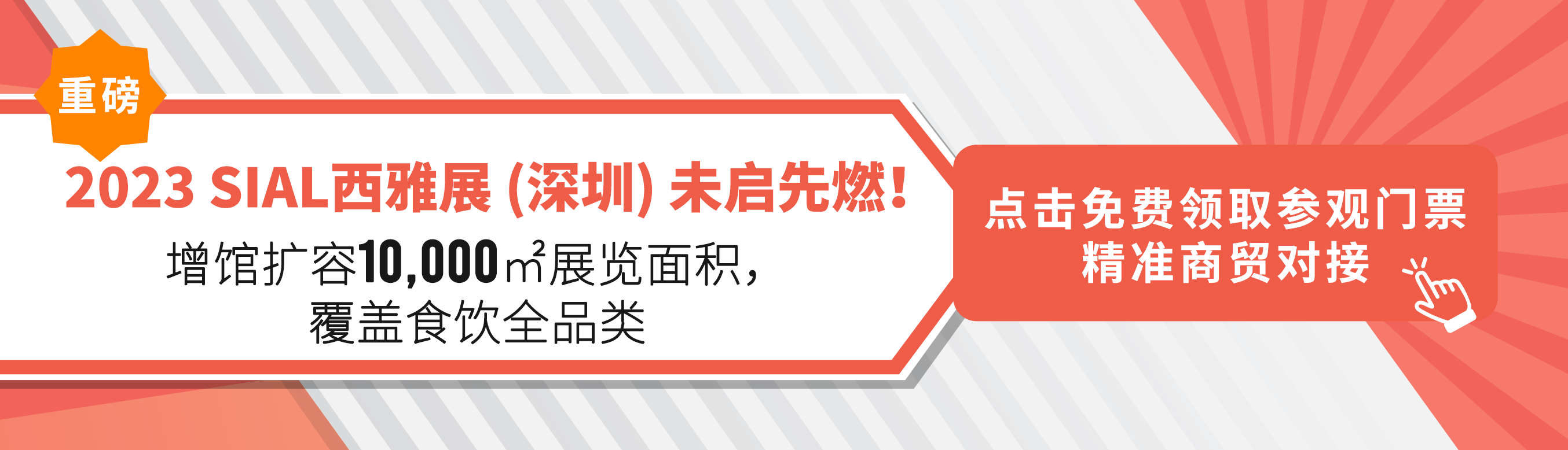 | 2023年8月28-30日,SIAL 西雅展 (深圳)將在深圳會(huì)展中心 (福田)盛大舉辦,經(jīng)過60年國際品牌沉淀,23年中國市場(chǎng)深耕,作為覆蓋全品類的華南國際食飲交易展,為滿足市場(chǎng)日益蓬勃的成交需求,SIAL西雅展 (深圳)將在原有規(guī)模上增設(shè)10,000平米的展覽面積,展覽面積將達(dá)45,000平米,向行業(yè)和展商提供更佳的服務(wù)場(chǎng)景。 | |||