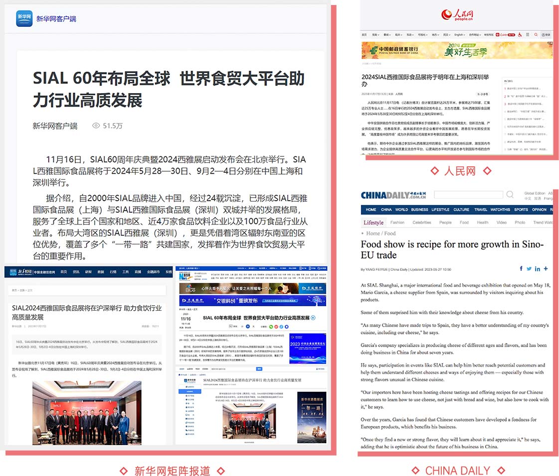 SIAL西雅展憑借著自身的國際化基因以及對于食飲貿(mào)易的促進(jìn)效果,持續(xù)受到600+各方媒體的關(guān)注和報道,包括新華社、人民日報、中國新聞社、CHINA DAILY等權(quán)威媒體和浙江衛(wèi)視、深圳衛(wèi)視、山東電視臺、浦東電視臺、上海廣播電視臺外語頻道等多家電視媒體。這些媒體在展會現(xiàn)場為品牌展商提供多元且權(quán)威的報道,助力展商品牌曝光、產(chǎn)品流通。