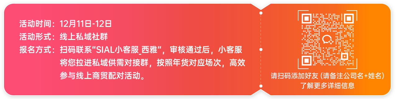 2023 SIAL西雅展秋冬食飲采購節(jié)吸引2000+家食飲上下游企業(yè)、數(shù)萬專業(yè)買家共同參與,10+私域社群聯(lián)動(dòng)推介熱門年貨產(chǎn)品,專業(yè)買家線上集中選品,與意向采購展商高效建立商貿(mào)合作鏈接。