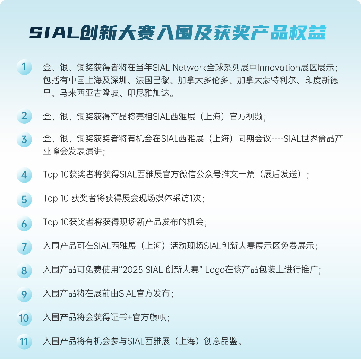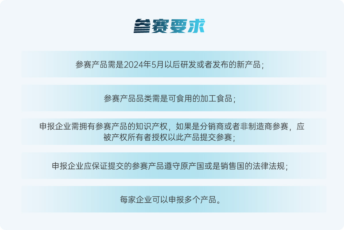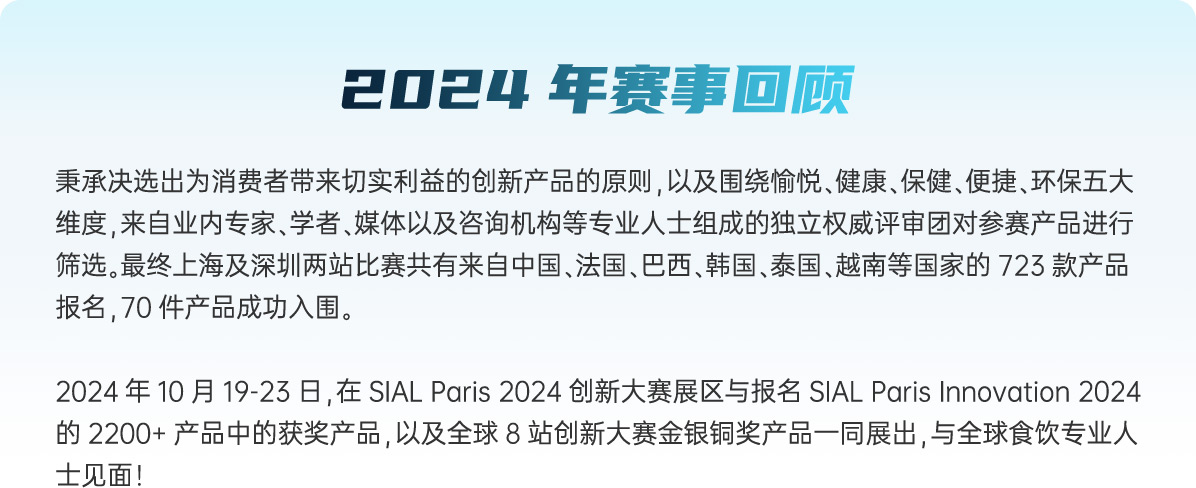 “第二十三屆 SIAL Innovation創(chuàng)新大賽”正式開(kāi)賽,所有已經(jīng)確認(rèn)參加2025年SIAL西雅展(上海)展商(獨(dú)立展商及展團(tuán))均可通過(guò)登錄“展商中心”---參與創(chuàng)新大賽報(bào)名,報(bào)名申請(qǐng)將于2025年4月11日截止。