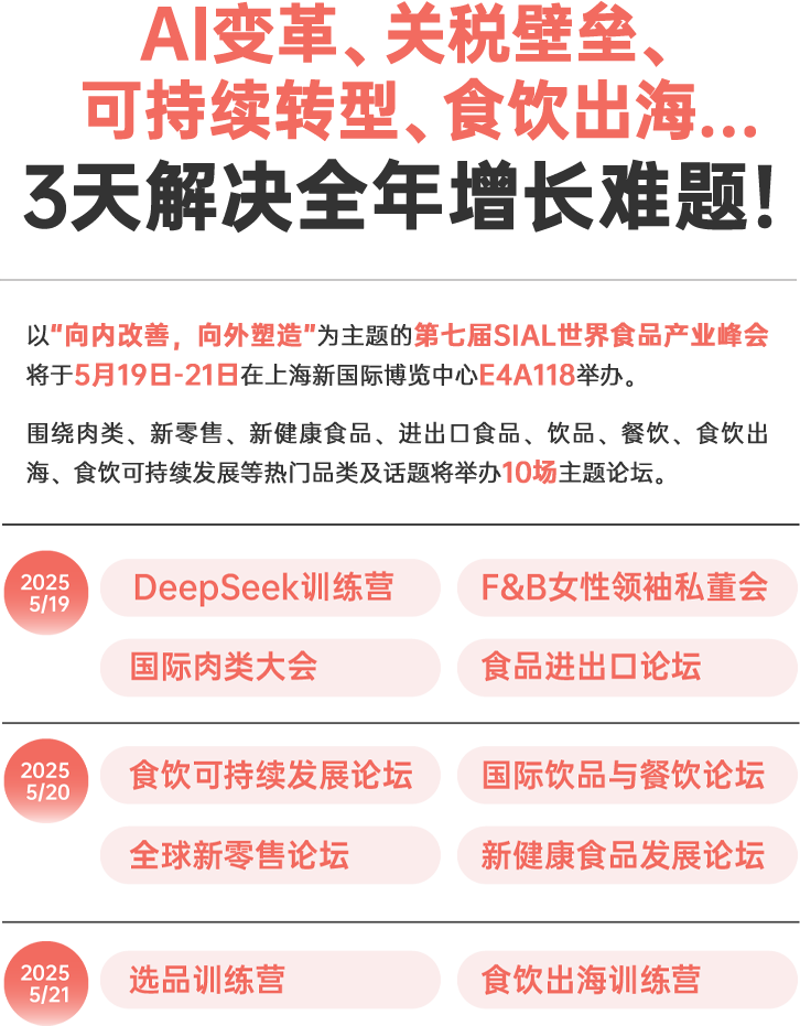 *請(qǐng)注意,本屆峰會(huì)門(mén)票不包含SIAL西雅展(上海)參觀門(mén)票,請(qǐng)您盡快完成展會(huì)實(shí)名注冊(cè) |