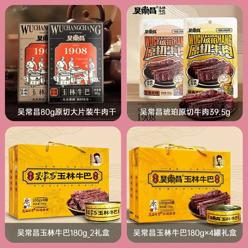 吳常昌始創(chuàng)于1908年。是廣西玉林市歷史悠久最負盛名的牛巴品牌。工藝傳承自南宋。精選牛后腿肉,獨家秘方烹制而成,色似咖啡,美味甘香,風味獨特。