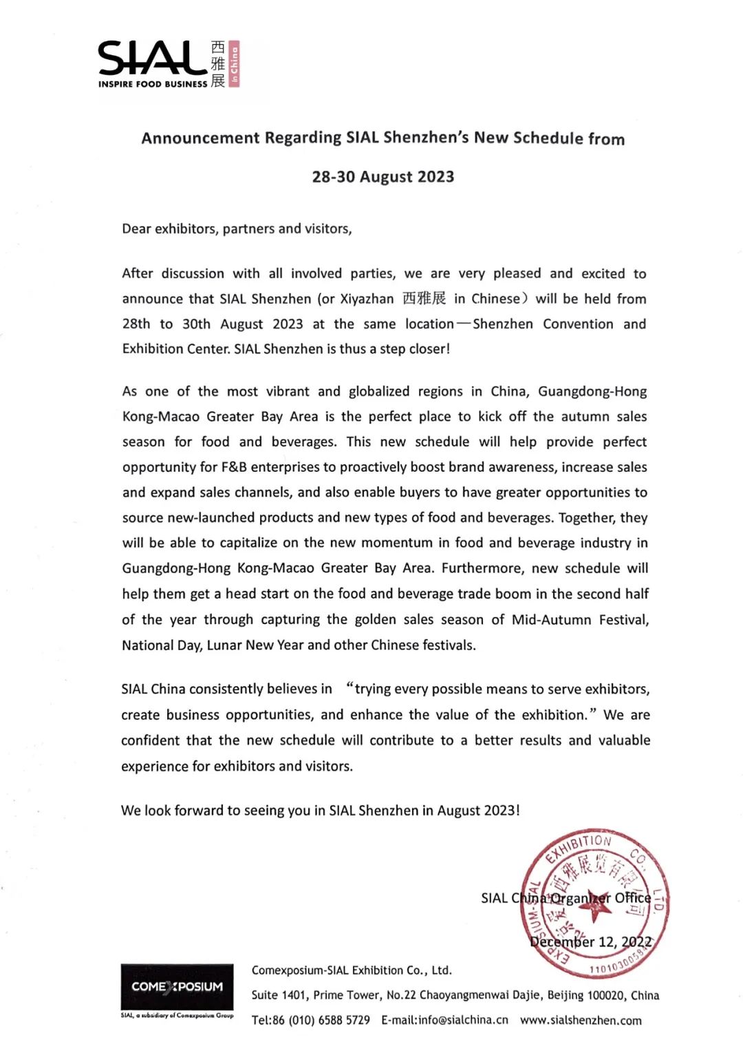 經(jīng)過(guò)與各方協(xié)調(diào),我們很高興甚至很激動(dòng)地宣布:SIAL西雅國(guó)際食品和飲料展覽會(huì)(深圳)——音譯中文簡(jiǎn)稱:SIAL西雅展(深圳),將定檔于2023年8月28日至30日舉辦,地點(diǎn)仍在深圳會(huì)展中心(福田)。SIAL西雅展(深圳)距離與大家的見(jiàn)面又更近了一步。